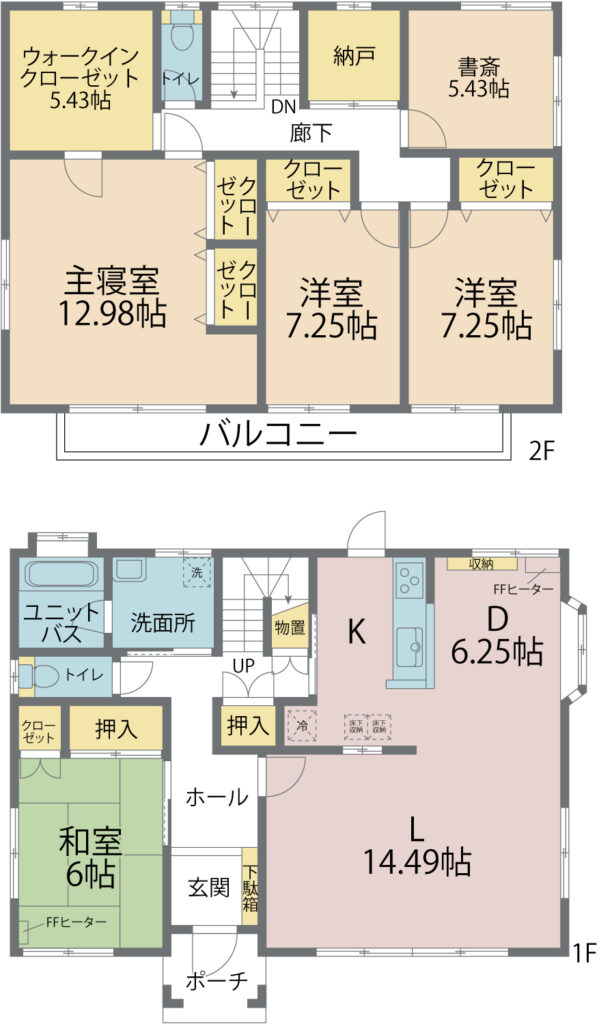 L14.49畳 1階 D6.25畳 1階 和室6畳 1階 洋室12.98畳 2階 洋室7.25畳 2階 2室 洋室5.43畳 2階 2室 |