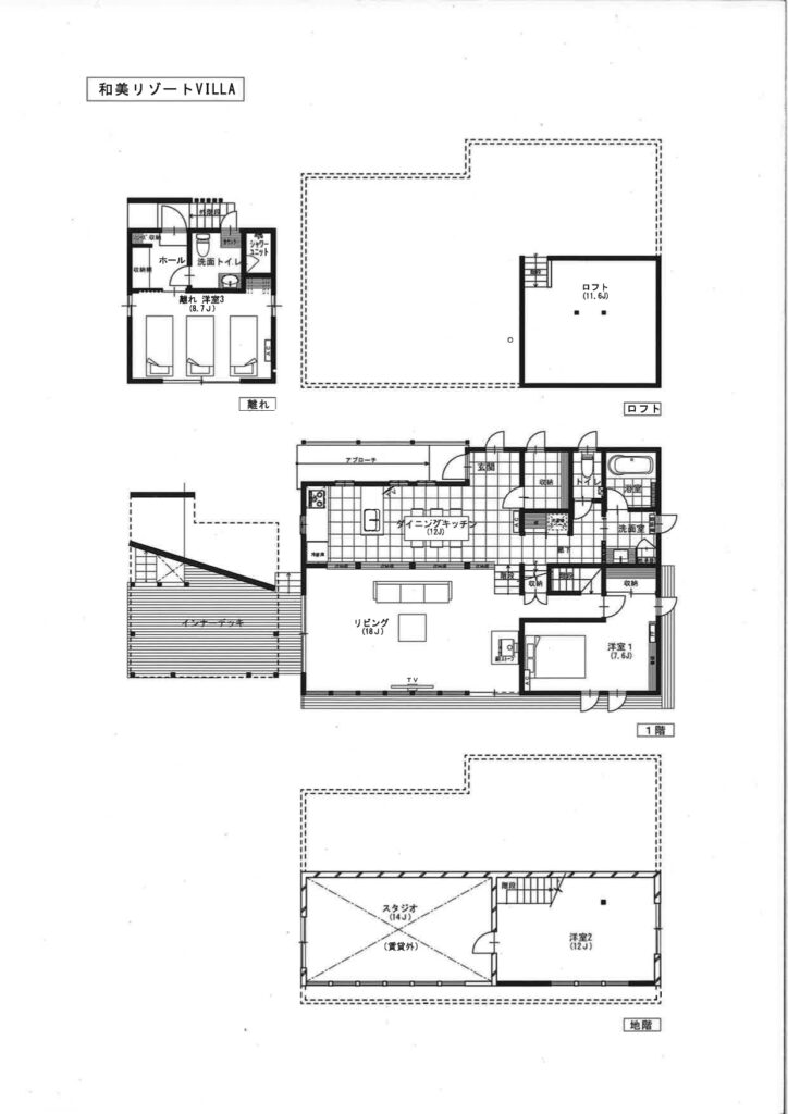 (間取) (外観) (居間) ダイニング キッチン (風呂) 360度画像有り☆【シーズン貸】和美リゾートヴィラ 画像7 360度画像有り☆【シーズン貸】和美リゾートヴィラ 画像8 (寝室) ロフト 地下1F 離れベッドルーム 離れ洗面所 離れシャワールーム